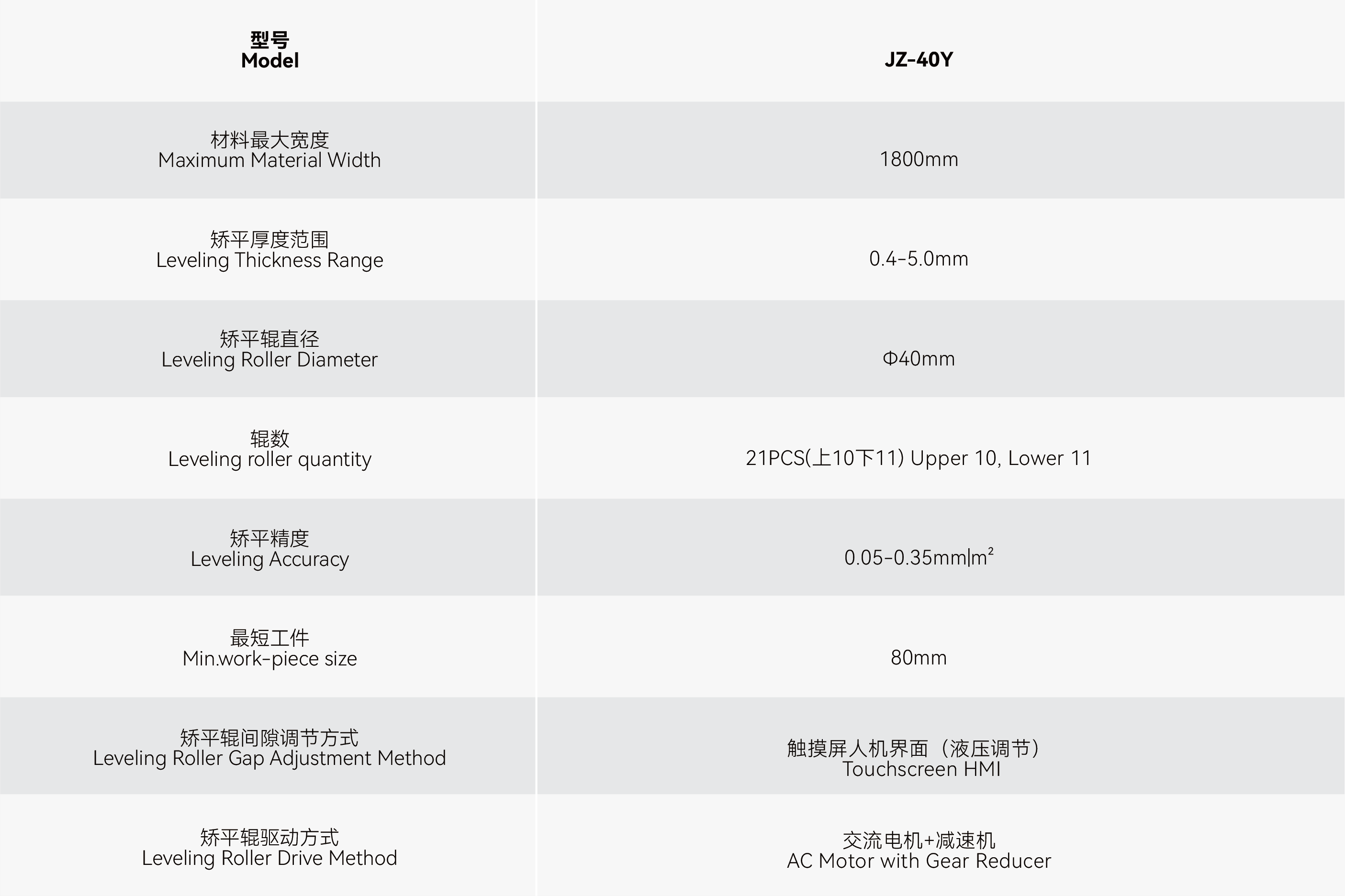 九重液压超精密矫平机 JZ-40Y,聚焦通讯柜、储能柜网板矫平需求,适配 0.4-5.0MM 厚度板材,为重型网板加工提供可靠解决方案。该设备由入料滚筒,出料滚筒等组成,人工将要矫平的工件放到入料滚筒传输工件进入到矫平机,矫平辊加上下支撑保证辊的不可压缩性,完美的降低了上下矫平辊之间的空白空隙,利用材料的“包辛格效应”对板材多次反复弯曲,交变弯曲的强度往出口处逐渐减小,随着矫平辊的数量增多,交变弯曲次数也同样增加使多种原始曲率逐步变为单一曲率,并最终将其矫平,达到工艺要求的平整精度。矫平完成矫平的工件由出料口传出并由人工码。针对通讯柜安装精度、储能柜结构稳定性对网板的高要求,JZ-40Y 能高效实现厚板材精密矫平,助力提升产品装配质量与生产效能。